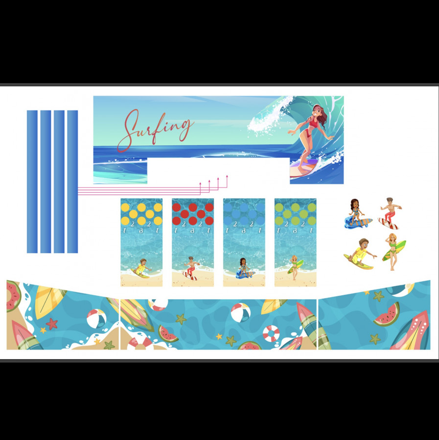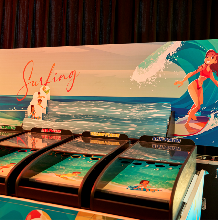 Available in more than 15 standard roll a ball themes including surf boards and boats.